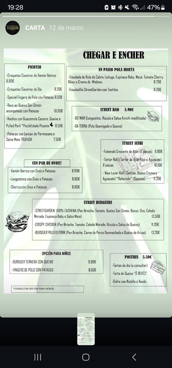 Welcome to StreetGarden, a vibrant cafeteria located in Bertamirans, A Coruna. This delightful spot is celebrated for its innovative and varied menu that caters to all tastes, making it an ideal locale for both quick bites and special occasions. Guests rave about the outstanding quality-to-price ratio, with an average cost of just 20-25€ per person, making it an affordable dining choice.